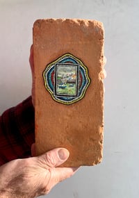 Discarded chewing gum from the street, on found and renovated brick. Painted on acrylic enamel and burnished with a blow torch. A miniature painting of the Harbour in St Monans, a fishing village in the East Neuk of Fife.